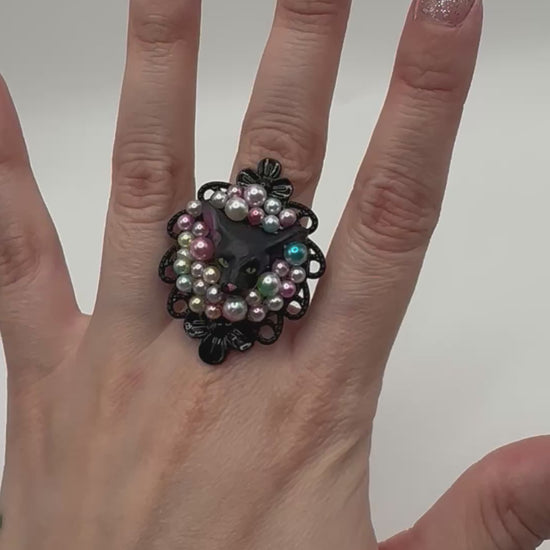 Fabulous black ornate floral frame ring with pastel bubble beads and a black cat with two different colored eyes front in center. Absolute statement piece! One of a kind. Ring is Fully Adjustable.