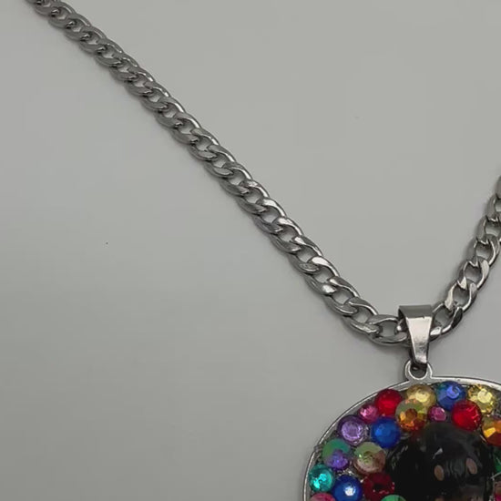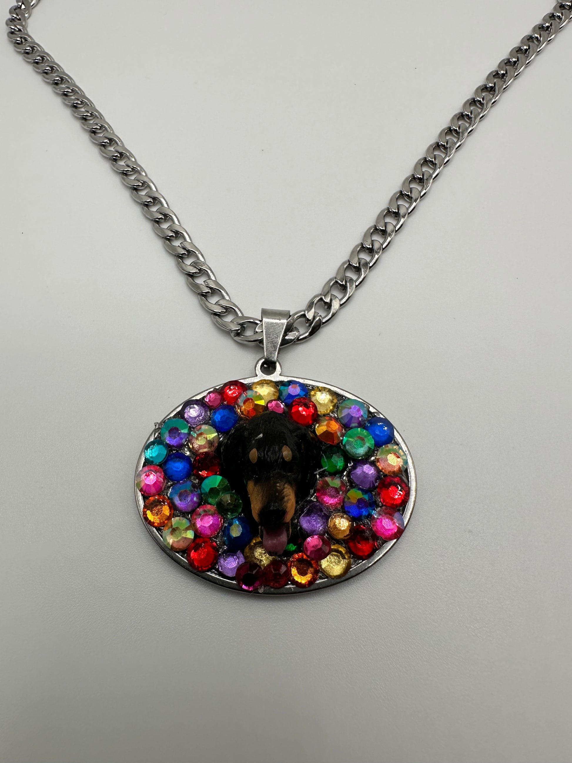 Unleash your inner pup-lover with our Rainbow Polkadot Dachshund Necklace! This snazzy accessory features a charming dachshund pendant decked out in multicolored rhinestones, all hanging off a sturdy 16-inch silvertone chain. Perfect for adding a dash of whimsy to any outfit (or just to make your friends drool with envy)! 🐾✨