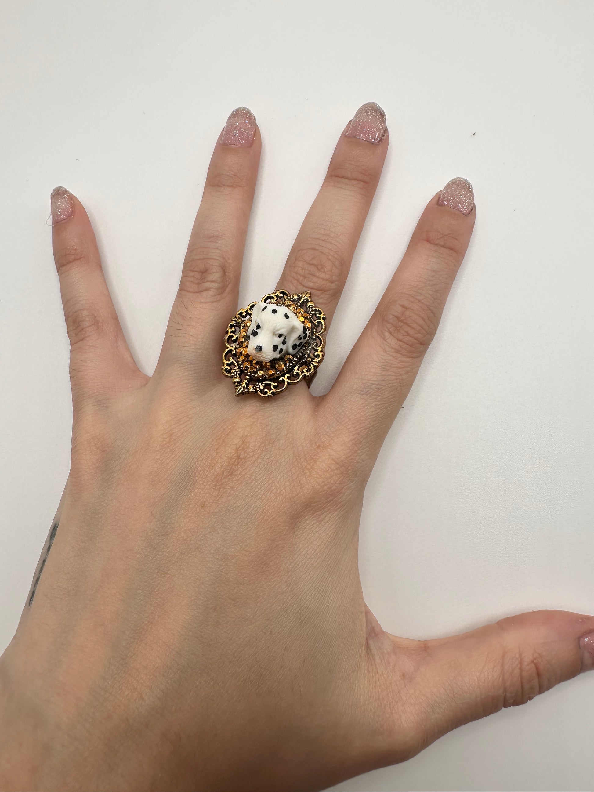 Fabulous golden ornate regal frame with gold rhinestones and a Dalmatian front and center. Fully Adjustable.